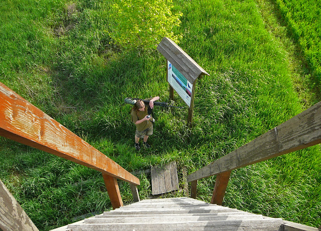 Na stawy przyjeżdżamy kwadrans przed 6-tą - już z auta udaje się wypatrzeć pierwsze czaple modronose, które płoszą się z położonych przy samym parkingu stawków narybkowych. Tego dnia obserwujemy w sumie 10 ptaków. W tym samym miejscu żerują też 3 czaple nadobne i pierwsze ślepowrony. W powietrzu poluje ponad 50 brzegówek. Rano turystów brak - dopiero w drodze powrotnej (ok. 9) mijamy pierwszych zwiedzających z lunetami i szkolną wycieczkę.