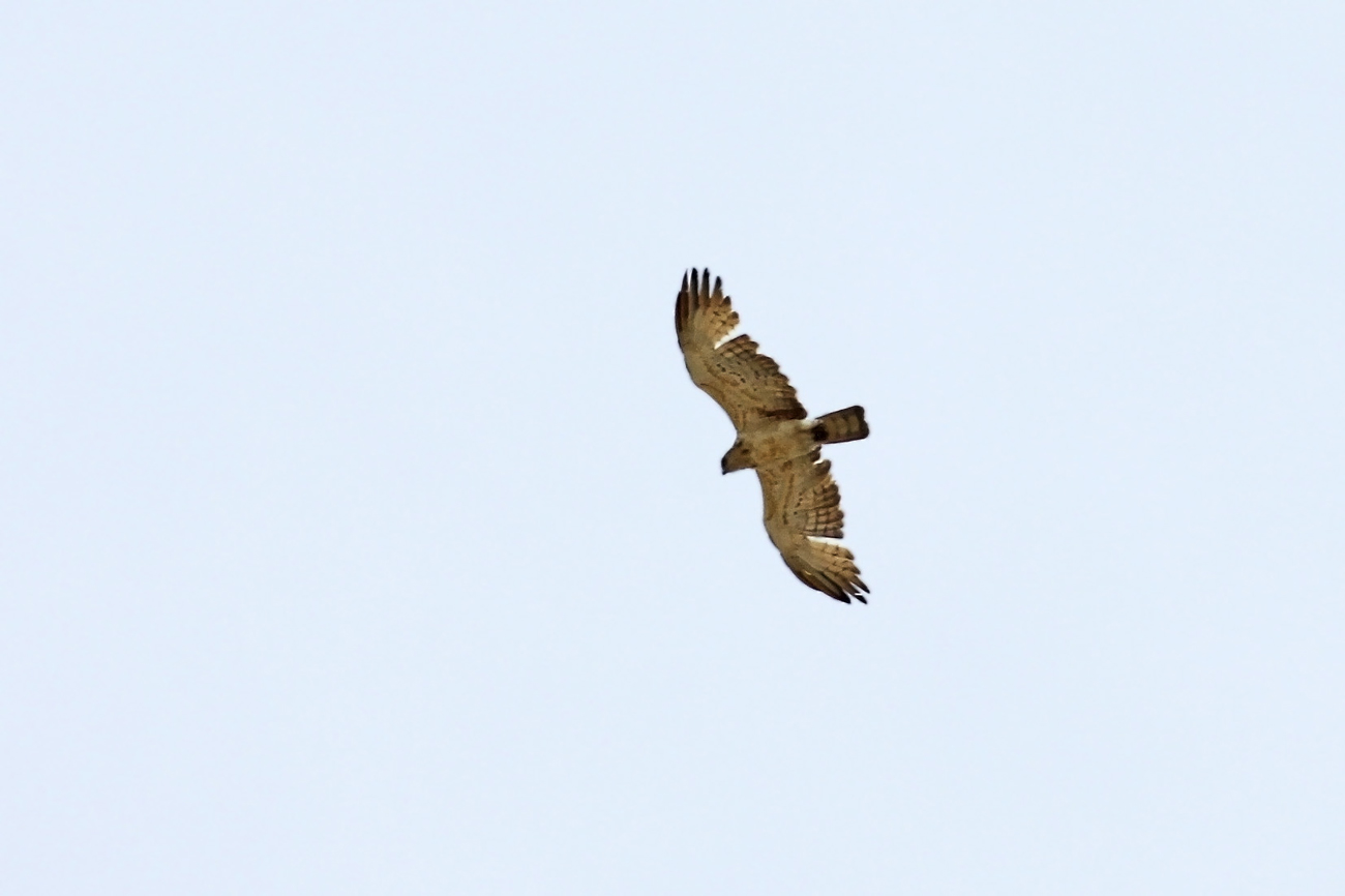 Nie przewidzieliśmy jednej rzeczy - pomiędzy wysokimi ścianami wąwozu, nasza nawigacja zupełnie nie potrafi się odnaleźć i po chwili dochodzimy do wniosku, że stała się całkowicie bezużyteczna. Jesteśmy zdani wyłącznie na intuicję i interpretację opisów poszukiwanych miejsc. Lokalizacja z trznadlem skalnym okazuje się być jedną z tych, w której obserwowaliśmy ortolana. W pasie zakrzaczeń z zaganiaczem pustynnym odnajdujemy tylko kilka zaganiaczy bladych. Albo mamy pecha, albo... Zaraz za miejscem z zaganiaczami miały być widziane gilaki blade. Ponieważ akurat tutaj wąwóz się rozszerza, daje nam to szansę na pieszy rekonesans po okolicznych wzgórzach. Nie odchodzimy daleko od auta, kiedy nad nami przelatują dwa gilaki blade!! Widzieliśmy je przez krótką chwilę, ale o pomyłce z niebudzącymi tu sensacji gilakami pustynnymi nie może być mowy - wraz z Pawłem dostrzegliśmy białe boki ogonów oraz wyraźne różowe panele na skrzydłach. Niestety, ale ptaki zapadły się pod ziemię... podczas poszukiwań udaje nam się zaobserwować jedynie tworzący się nad górami komin z 22 trzmielojadami i nieoznaczonym sępem.