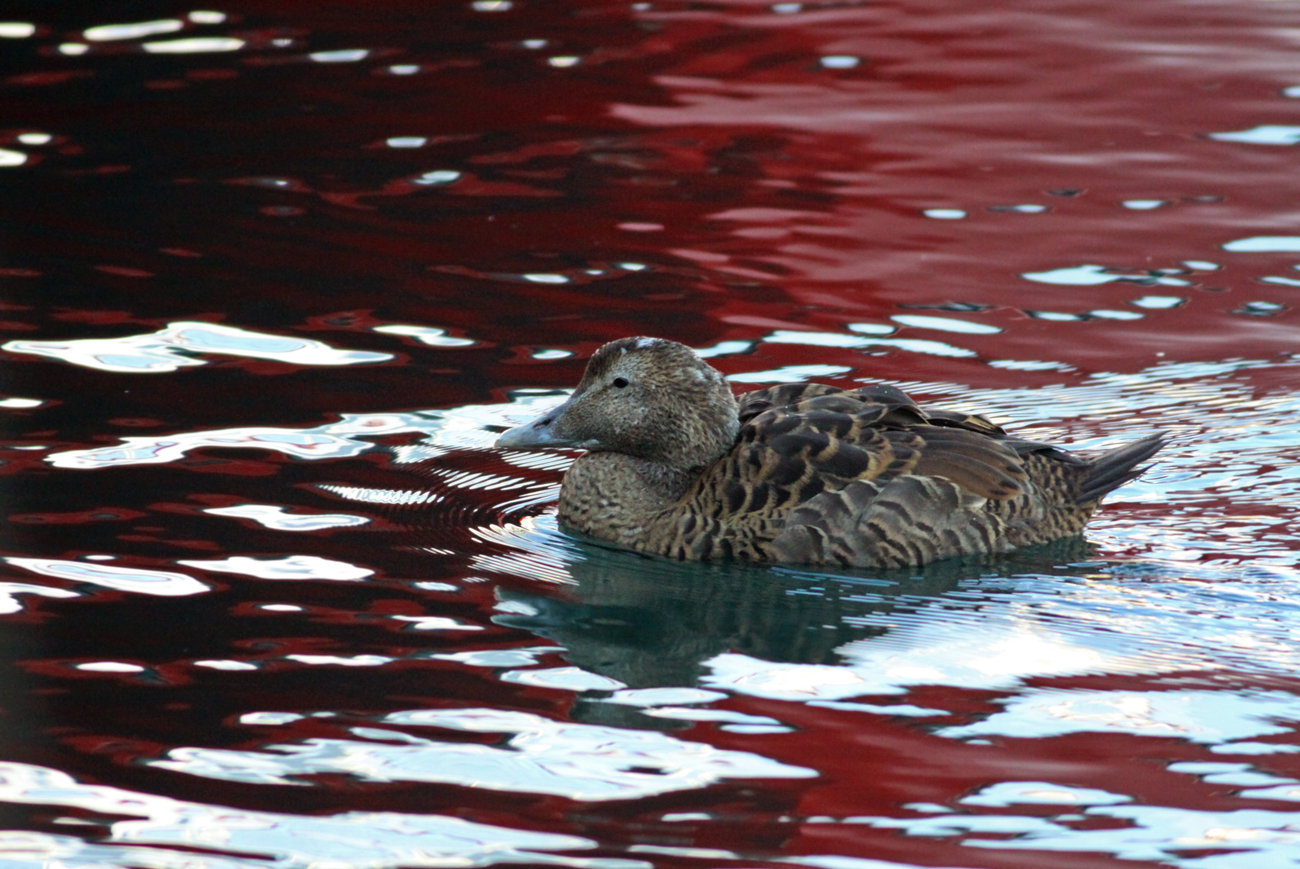 Reykjavík! Cieszę się, że wracam do jego nietuzinkowej atmosfery "prowincjonalnej stolicy", chociaż ptasio raczej nie zostanę już dziś rzucony na kolana. W domu zostawiam nawet lunetę, co wiele może powiedzieć o moich oczekiwaniach od najbliższych paru godzin. Przed 9-tą zajeżdżamy do portu, gdzie Adam, Łukasz i Paweł ponownie ładują się na pokład jednostki, która tym razem ma ich doprowadzić do prawdziwych wielorybów. Jeszcze zanim się z nami pożegnają, wspólnie fotografujemy pływającego przy samym pomoście nurnika, którego w krystalicznie czystej wodzie możemy obserwować nawet podczas żerowania pod wodą - świetna sprawa, może jednak nie będzie tu tak źle z ptakami? Wielorybnicy wyruszają w morze, a ja z Marianem rozpoczynamy obchód basenów portowych w poszukiwaniu turkana - czyli tak naprawdę, stada edredonów, których się trzyma. Kilka pierwszych basenów zapisze się w historii jedynie udaną sesją z dorosłą mewą polarną. W ostatnim zanosi się na przełom, kiedy podchodząc stadko wypoczywających biegusów morskich (20 ptaków), wychylam się zza nabrzeża i wypłaszam przyczajoną grupę kilkunastu "edków" - choć jednak ptaki przeglądam z bliska gołym okiem, to turkana w nich nie widzę... Chwilę potem, kiedy kaczki są już ładne sto metrów od nas, Marian raz jeszcze przegląda stadko w lunecie i twierdzi, że jednak widzi tam turkana! Czy mogłem popełnić aż taki błąd? Przyglądam się podejrzanemu, ale na nieszczęście cała grupa ustawiona jest pod słońce, a ponadto wpływa już za najdłuższe nabrzeże, wrzynające się w środek basenu - musimy wrócić się kilkaset metrów. Manewr jednak się opłacał, bo po paru minutach czekania, ptaki ładują się pod nasze obiektywy. Naprawdę dłuższą chwilę ustalamy jednak, który z nich jest niby-turkanem. Coś tu nie gra. Jeden z ptaków rzeczywiście jest inny: ma okrągłą głowę bez wyraźnego klinowatego profilu oraz "żagielki" z piór na grzbiecie jak turkan, a jednocześnie jasny dziób bez "uśmiechniętego" zajadu i ciemnego paznokcia oraz prążkowany bok jak edredon. Późniejsze konsultacje wykażą, że to podgatunek edredona - borealis, charakteryzujący się właśnie zaokrągloną głową, krótszym dziobem i występującymi czasem "żagielkami" z piór. Na czystego krwi turkana Marian będzie musiał jeszcze trochę poczekać.